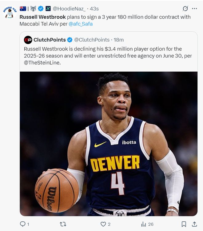 美记JD杰克逊透露:拉塞尔-威斯布鲁克依旧存在重返丹佛掘金的可能性,掘金只是他的一个选择。