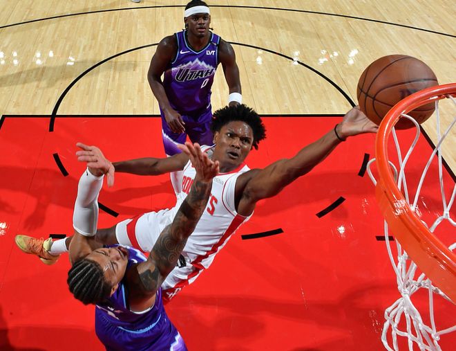 次节比赛,双方进攻火力均是大幅升级展开对攻,两队第二节合计狂轰80分,比首节多出32分。双方率先缠斗至30-30,火箭外线三分开火逐步取得37-32领先优势,爵士追回3分。火箭连得6分扩大8分优势,爵士一波7-0攻势追到差1分,双方随后紧咬比分拉锯战缠斗。申京与阿门连续得分率队逐步取得11分优势,爵士连追5分,火箭单节44-36净胜8分,上半场结束火箭67-61反超爵士。前两节比赛,火箭3人得分上双,阿门19分6篮板4助攻2抢断,申京11+4+9+4与史密斯11分,杜兰特8分,爵士仅森萨博14分一人得分上双。