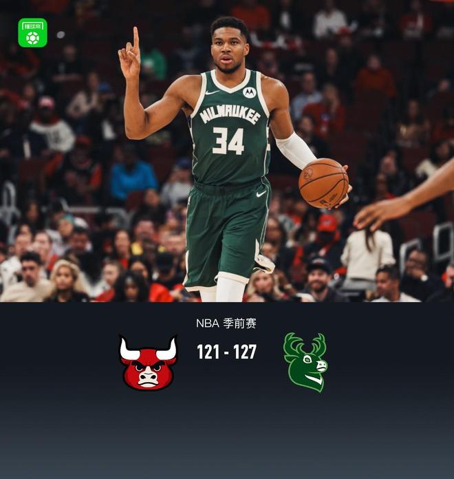第四节公牛杰文-卡特拿下7分,雄鹿莱恩-罗林斯拿下6分,最终公牛121-127不敌雄鹿