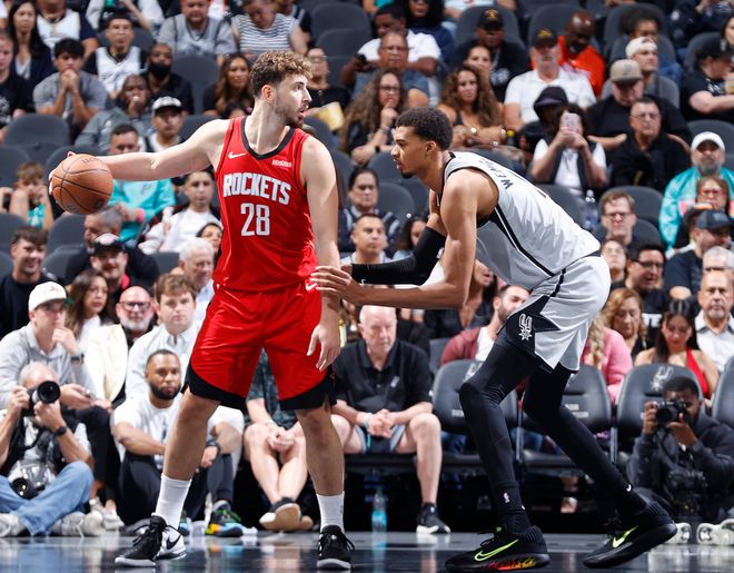 首节两队打防守大战,两队都是非常的打铁,火箭目前是进攻效率第一,防守效率第六的球队,而马刺是防守效率第二,这一节的防守大战两队的差距很小,申京这个点是连续单吃文班亚马,首节火箭还领先2分。