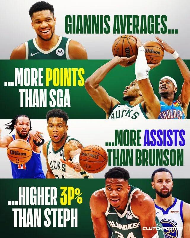这个赛季的字母哥强得有点可怕,得分比亚历山大33分高,助攻比布伦森6.1助多,三分命中率他比库里的38.9%要高(字母哥场均出手为1.6次)。