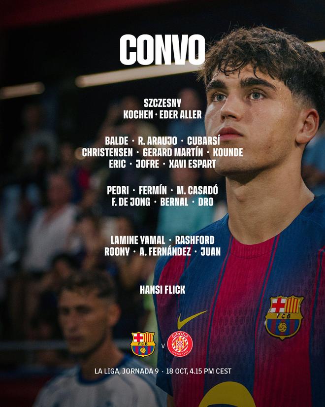 雷速体育10月18日讯 巴塞罗那俱乐部官方公布了本轮西甲主场对阵赫罗纳的球员名单,亚马尔和费尔明榜上有名、复出在即。