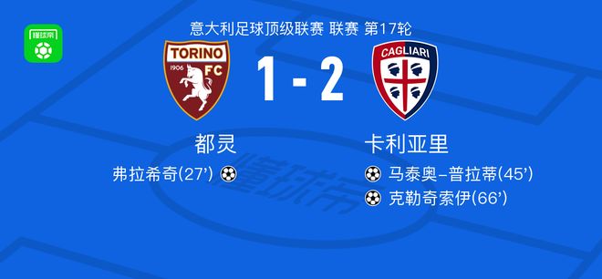 北京时间12月27日意大利足球顶级联赛 联赛 第17轮,都灵主场对阵卡利亚里。都灵弗拉希奇破门。卡利亚里马泰奥-普拉蒂破门,克勒奇索伊破门。最终比分都灵 1-2 卡利亚里。